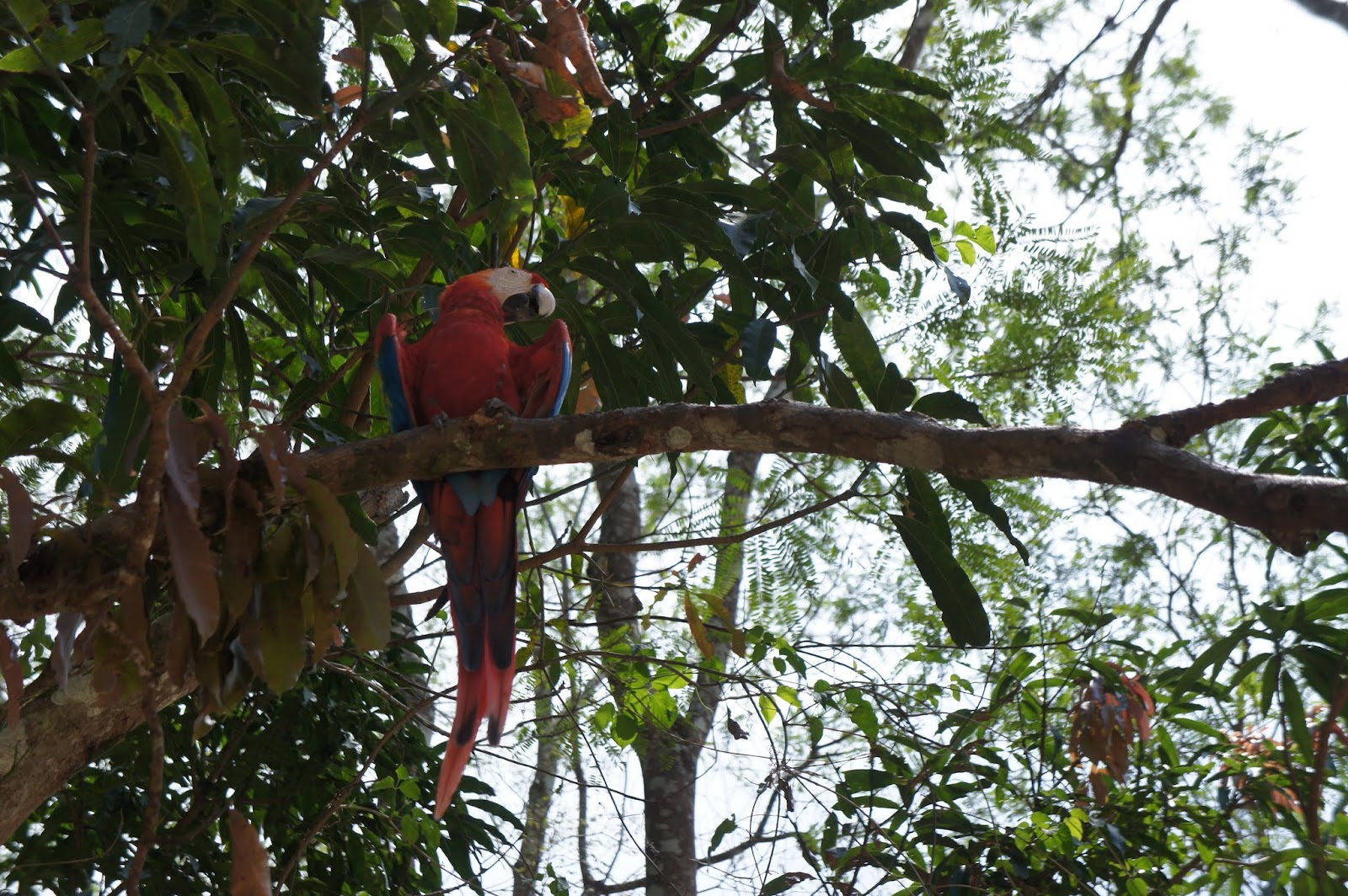 Nous passons la journée suivante sur le site, admirant d'abord tranquillement les nombreux édifices, escaladant les pyramides, tentant de décrypter les différents hiéroglyphes (en vain). On est fascinés par les perroquets multicolores qui fournissent une bande-son insolite à notre visite et qui volent d'arbres en arbres. On pique-nique dans les bains à vapeur, destinés à purifier les personnes à sacrifier. Puis, on fait appel à un guide afin de mieux comprendre le fonctionnement cette cité.